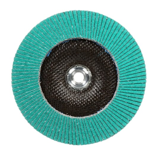 Ideal for tough grinding applications where final finish is important, the overlapping layers of the flaps on 3M™ Flap Disc 577F continually wear away with use to expose fresh abrasive mineral for a fast, consistent cut, while the cushioning of the flaps creates a blended finish. Flap discs typically generate a finish one grade finer than the disc is graded, reducing finishing steps. A grinding aid reduces grinding temperatures for processes involving heat-sensitive alloys such as stainless steel, nickel alloys, and titanium.