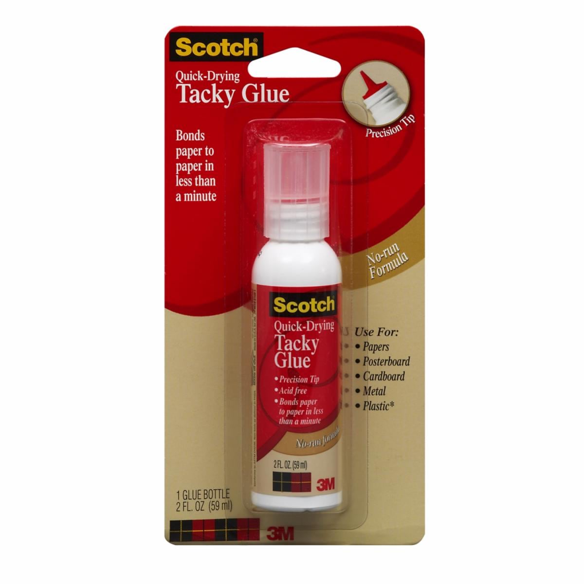 Scotch Quick Drying Tacky Glue is ideal for most home and office projects. No run formula reduces mess and ensures glue stays where you put it. Comes with fine tip applicator for precision application. Permanent adhesive dries quickly, won’t wrinkle or bleed through papers. Great for most papers, foamcore, posterboards, card stock, cardboard and for attaching a variety of 3 dimensional objects for project work.